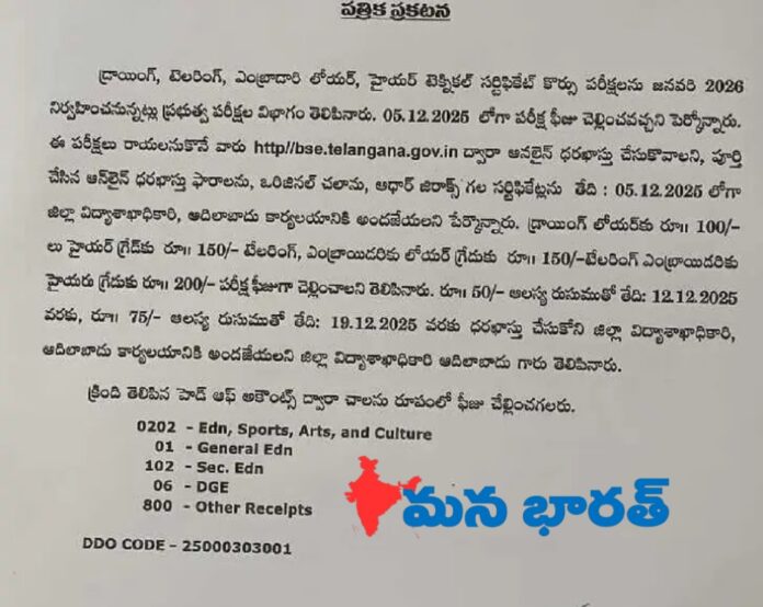 మన భారత్, ఆదిలాబాద్: డ్రాయింగ్, టైలరింగ్, ఎంబ్రాయిడరీ లోయర్ మరియు హయ్యర్ టెక్నికల్ సర్టిఫికెట్ కోర్స్ పరీక్షలు వచ్చే ఏడాది జనవరులో నిర్వహించనున్నట్లు ఆదిలాబాద్ జిల్లా విద్యాశాఖాధికారి (డీఈఓ) రాజేశ్వర్ వెల్లడించారు. ఈ కోర్సులకు ఆసక్తి ఉన్న అభ్యర్థులు డిసెంబర్ 5లోపు పరీక్ష ఫీజులు చెల్లించి దరఖాస్తు ప్రక్రియను పూర్తి చేయాలని ఆయన సూచించారు.