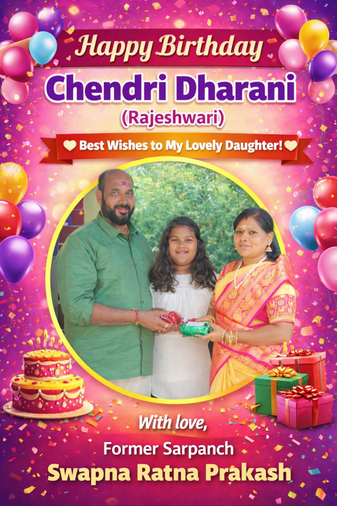 తాంసి మండలానికి చెందిన మాజీ సర్పంచ్ స్వప్న రత్న ప్రకాష్ తన కూతురు చెంద్ర ధరణి (రాజేశ్వరి) పుట్టినరోజు సందర్భంగా హృదయపూర్వక శుభాకాంక్షలు తెలిపారు. ఈ సందర్భంగా వారు తన కూతురికి ఆరోగ్యం, ఆనందం, విజయాలు నిండిన భవిష్యత్తు కలగాలని ఆకాంక్షించారు.